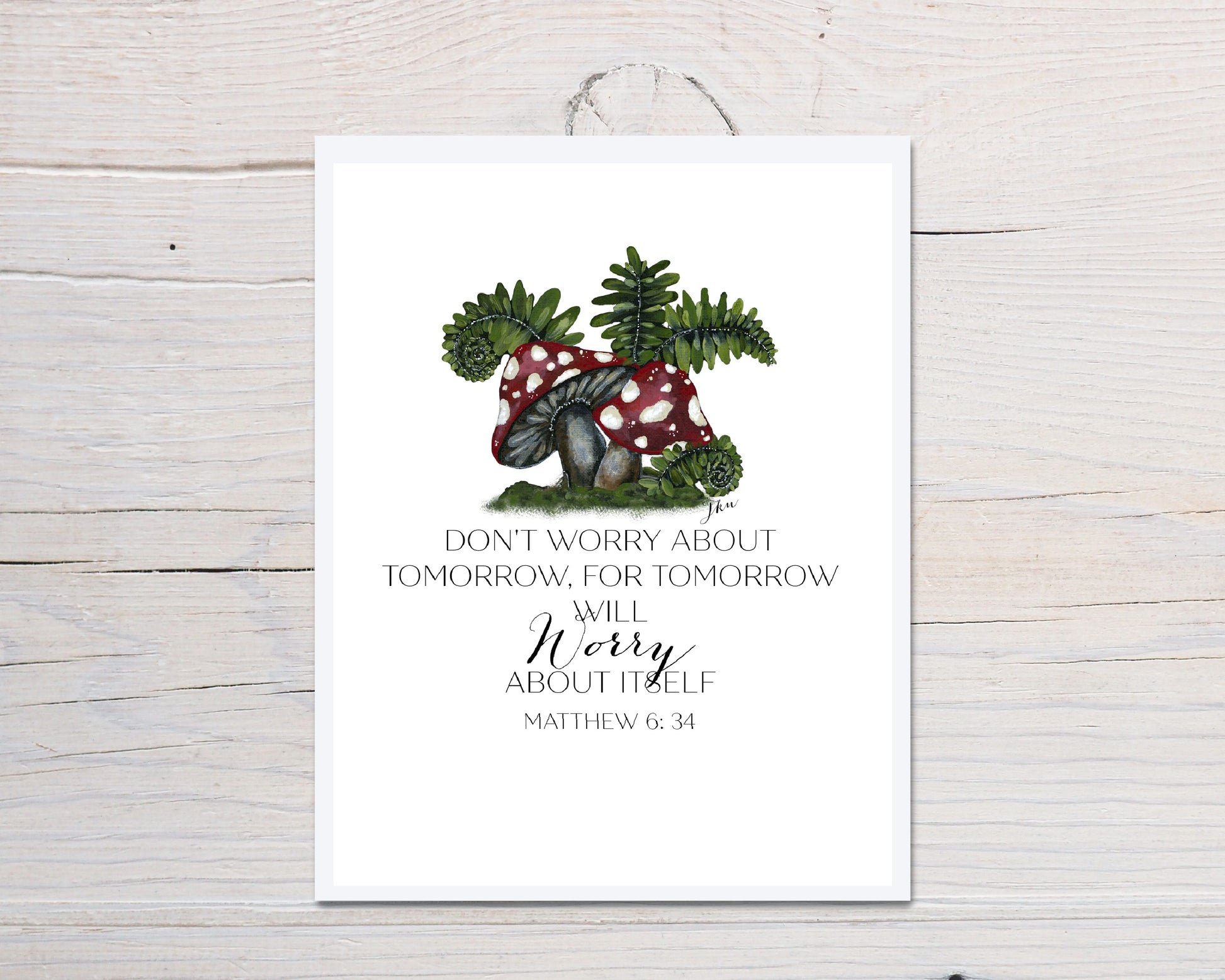 Discover the serene beauty of 'Mushroom', a tranquil depiction of mushrooms nestled in lively ferns on verdant grass, embodying the essence of Matthew 6:34. Elevate your space with this calming scene that invites you to leave tomorrow's worries for tomorrow, and cherish the present moment.